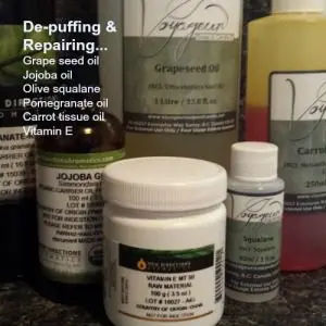 Six ingredients are all that is required to make an effective and luxurious De-puff and Repair Anti-Aging Eye Serum. All oils have been selected because they have been deemed safe for use around the delicate skin of the eye area, are useful for all skin types including sensitive skin, and they provide lightweight, fast-absorbing moisture with anti-aging benefits.