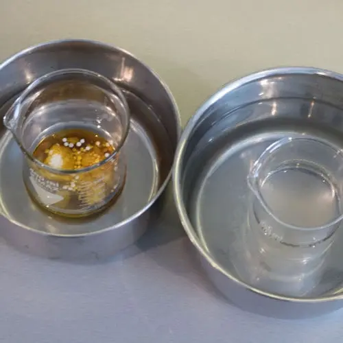 Heat both the water phase and oil phase containers in a water bath/bain-marie until both reach the same temperature (70°C or 158°F), measuring the temperature with a thermometer. You can choose to follow the “heat and hold” method if you like.