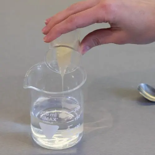 Cool the emulsion down by placing the beaker in a cold water bath (sink or saucepan filled with cold water) and mixing until cool.