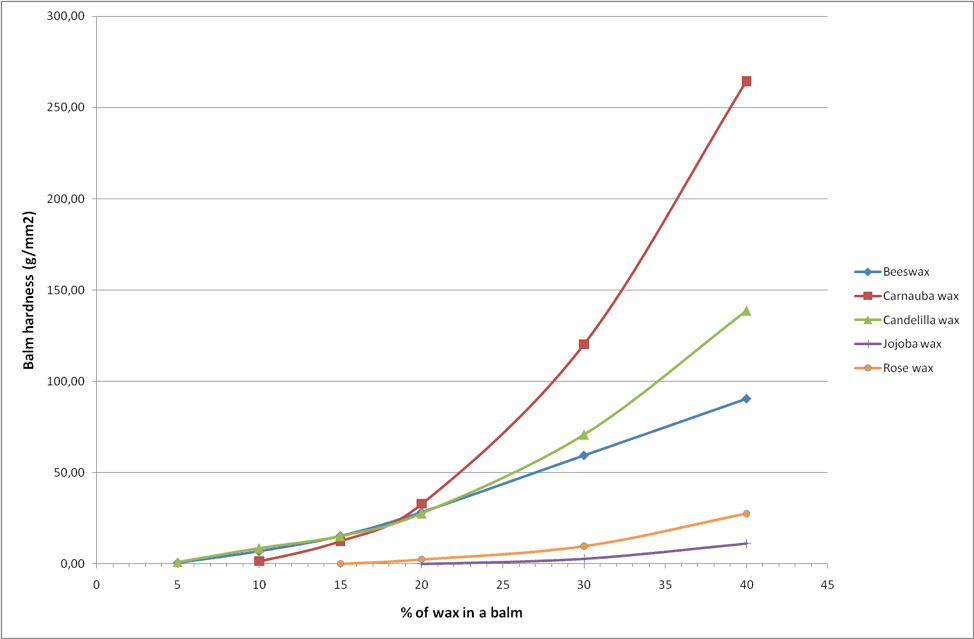 We have previously shared a simple, but luxurious, formula for a Cocoa Butter Lip Balm. It’s very easy to change this into a vegan product by switching the beeswax for a vegan wax. In the case of this formula, we used beeswax at 16%. As you can see from the chart above, at percentages between 15-20% beeswax, candelilla wax and carnauba wax create a similar level of firmness, so you can keep the percentage the same. Outside of this percentage range you might also need to change the percentage used.