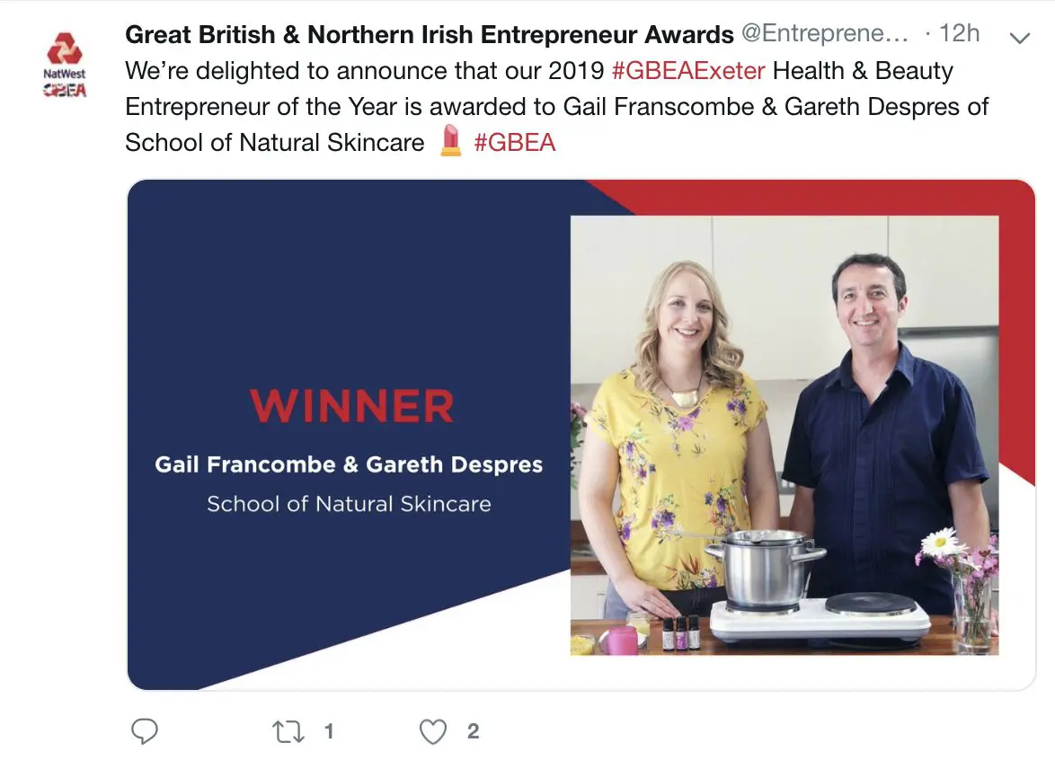 In October 2019, the School of Natural Skincare was honored to win the Health and Beauty Entrepreneur of the Year Award. This award recognized entrepreneurs making a meaningful difference in health, beauty, and wellbeing. It was the perfect way to kick off our 10th anniversary celebrations in January 2020, marking a decade since Gail and Gareth founded the School.