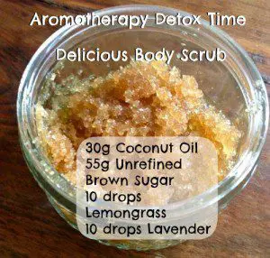- 30g of coconut oil, 55g of unrefined brown sugar, 10 drops of lemongrass, 10 drops of lavender.